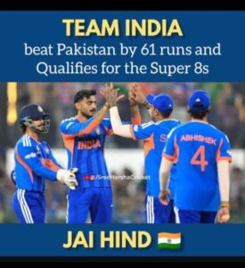 ಪಾಕಿಸ್ತಾನಕ್ಕೆ 61 ರನ್ ಭರ್ಜರಿ ಹೊಡೆತ! ಸೂಪರ್-8 ಹಂತಕ್ಕೆ ದಿಟ್ಟ ಹೆಜ್ಜೆ ಇಟ್ಟ ಭಾರತ.